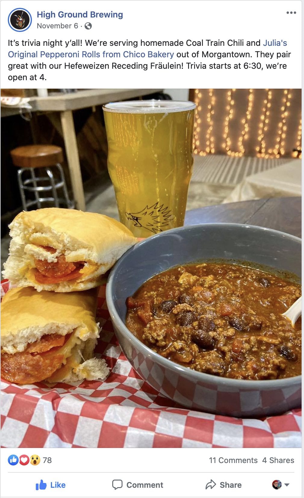 These days, effective social media is key to customer communication that builds business. Unfortunately not every WV brewery does a great job at this. High Ground Brewing, however, handles this task superbly. With Jana Wolfe at the helm, High Ground’s social media is frequent, detailed, and informative. I love their Facebook and Instagram posts. Check them, and you are never out of the loop. Jana keeps their website up to date too. A really strong performance.