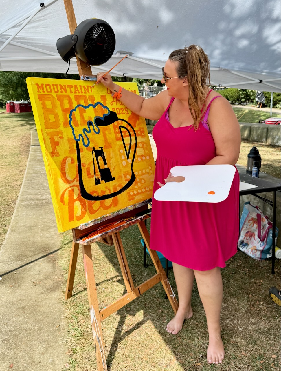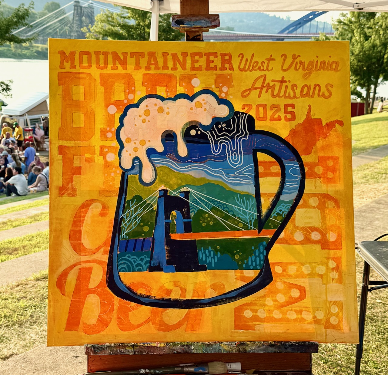 A new fundraiser this year is local artist Mindi Yarbrough donating her beer fest painting for a silent auction. The auction took place during the festival and all the proceeds from the auction go directly to the House of the Carpenter. Her painting features the historic Wheeling Suspension Bridge seen through a beer mug. Pretty cool, huh.