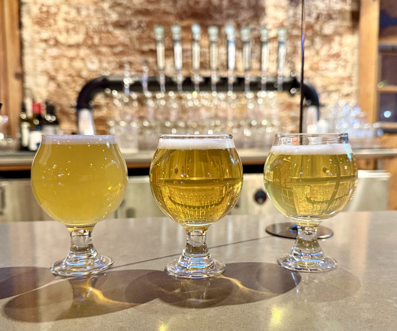 R to L are Euphonia Pilsner, Psychedelic Rabbit IPA, and Hazy Like A Fox Hazy IPA.